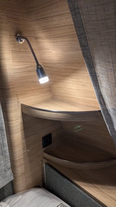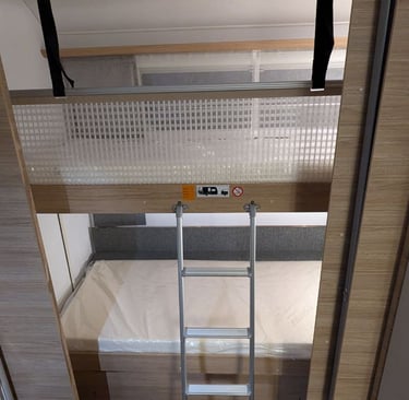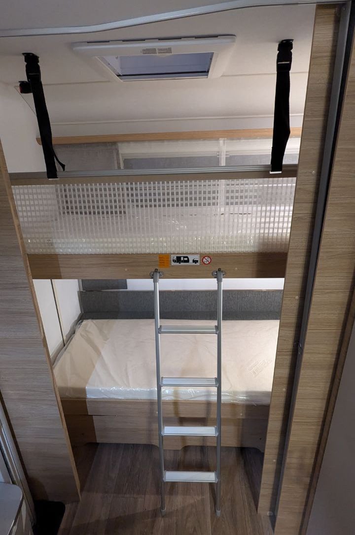 Etagenbetten im Heck: Ideal für Kinder – mit Sichtschutzvorhängen für mehr Privatsphäre.